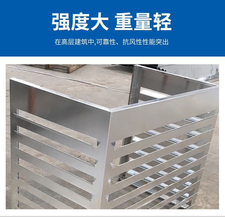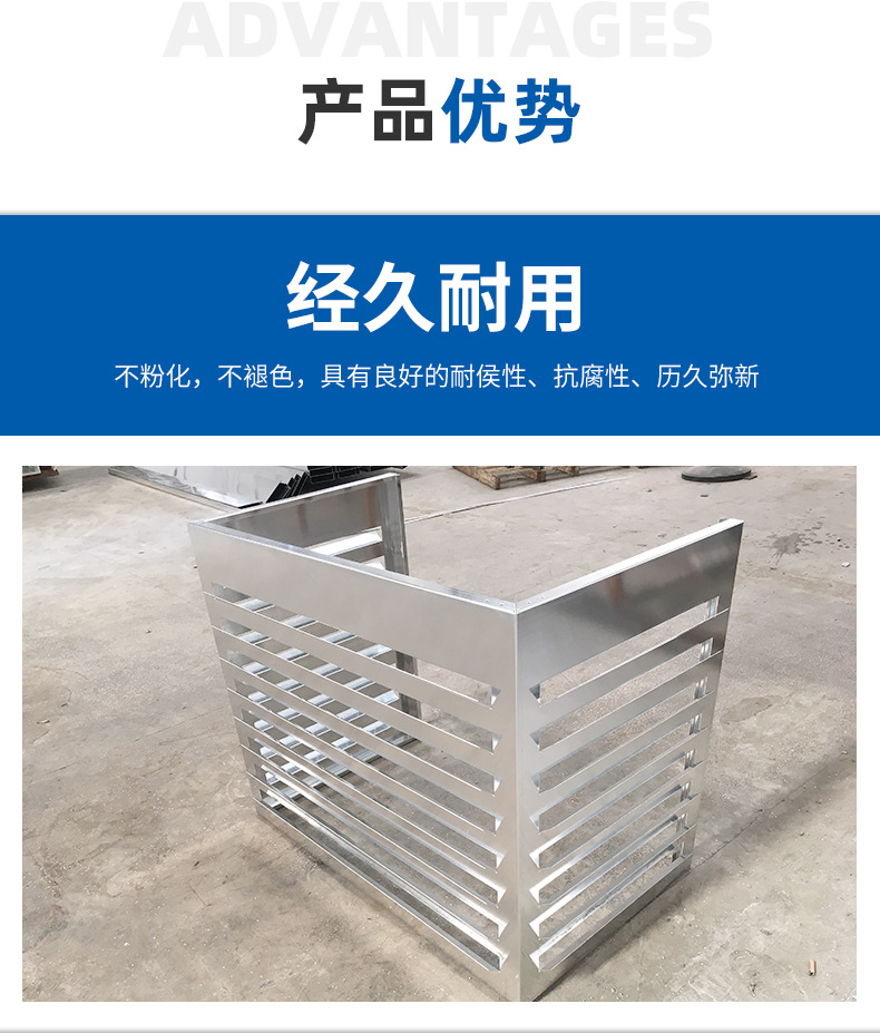 空調罩,空調保護罩,空調外機罩,空調防護罩,空調防塵罩,鋁合金空調罩,鋁合金空調保護罩,鋁合金空調外機罩,空調外機保護罩產品廣泛用于美化小區樓盤,遮掩室外空調主機,美化樓宇建筑的外觀。有著美觀大方、散熱良好、堅固耐用的特點。鋁合金空調保護罩折角處采用加強筋進行加固。能有效延長您的空調使用壽命!